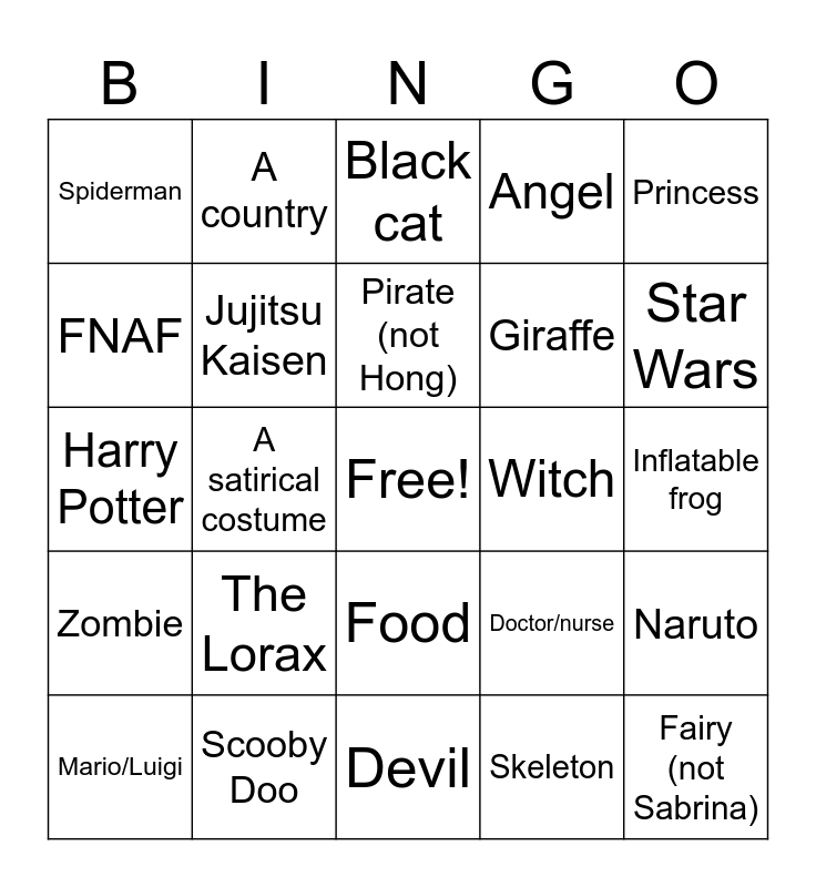 This bingo card has a free space and 24 words: The Lorax, Scooby Doo, Pirate (not Hong), Mario/Luigi, Princess, Spiderman, FNAF, A country, Witch, Food, Giraffe, Harry Potter, Doctor/nurse, Naruto, Jujitsu Kaisen, Skeleton, Inflatable frog, Black cat, Star Wars, A satirical costume, Fairy (not Sabrina), Zombie, Angel and Devil.