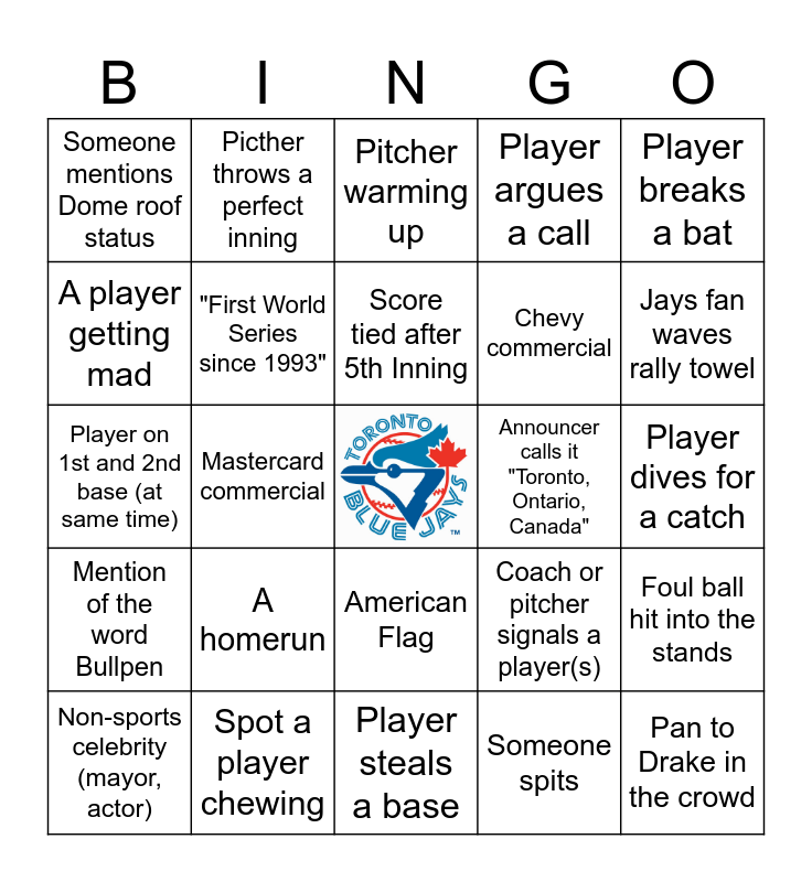 This bingo card has a free space and 29 words: Non-sports celebrity (mayor, actor), CN Tower, Mastercard commercial, Strike-out, Someone mentions Dome roof status, Pitcher warming up, "First World Series since 1993", A homerun, Announcer calls it "Toronto, Ontario, Canada", Spot a player chewing, Player dives for a catch, Pan to Drake in the crowd, Player steals a base, Someone spits, Jays fan waves rally towel, Double play, American Flag, Mention of the word Bullpen, Player breaks a bat, Player on 1st and 2nd base (at same time), Coach or pitcher signals a player(s), Bo Bichette hair mention, Chevy commercial, A player getting mad, Player argues a call, Picther throws a perfect inning, Foul ball hit into the stands, Score tied after 5th Inning and Crowd does the wave.