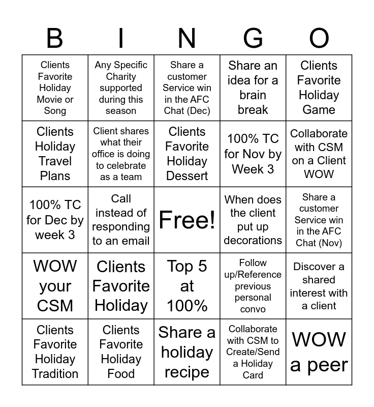 This bingo card has a free space and 24 words: Clients Favorite Holiday, Clients Favorite Holiday Food, Clients Favorite Holiday Dessert, Clients Favorite Holiday Tradition, Clients Favorite Holiday Game, Clients Favorite Holiday Movie or Song, Clients Holiday Travel Plans, Any Specific Charity supported during this season, When does the client put up decorations, Top 5 at 100%, 100% TC for Nov by Week 3, 100% TC for Dec by week 3, Follow up/Reference previous personal convo, Discover a shared interest with a client, Client shares what their office is doing to celebrate as a team, Collaborate with CSM to Create/Send a Holiday Card, Share a customer Service win in the AFC Chat (Nov), Share a customer Service win in the AFC Chat (Dec), Collaborate with CSM on a Client WOW, Call instead of responding to an email, WOW a peer, WOW your CSM, Share an idea for a brain break and Share a holiday recipe.