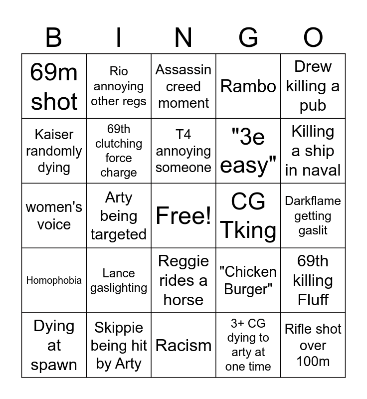 This bingo card has a free space and 24 words: Lance gaslighting, Skippie being hit by Arty, T4 annoying someone, Dying at spawn, Drew killing a pub, 69m shot, Kaiser randomly dying, Rio annoying other regs, CG Tking, Reggie rides a horse, "3e easy", women's voice, "Chicken Burger", 69th killing Fluff, 69th clutching force charge, 3+ CG dying to arty at one time, Darkflame getting gaslit, Assassin creed moment, Killing a ship in naval, Arty being targeted, Rifle shot over 100m, Homophobia, Rambo and Racism.