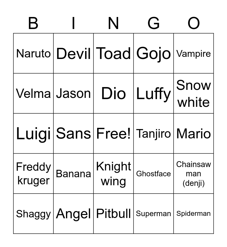 This bingo card has a free space and 24 words: Banana, Angel, Dio, Shaggy, Vampire, Naruto, Velma, Devil, Tanjiro, Knight wing, Luffy, Luigi, Ghostface, Chainsaw man (denji), Jason, Superman, Mario, Toad, Snow white, Sans, Spiderman, Freddy kruger, Gojo and Pitbull.