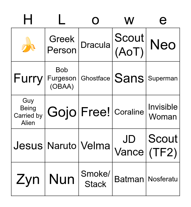 This bingo card has a free space and 24 words: Naruto, Nun, Ghostface, Zyn, Neo, 🍌, Furry, Greek Person, Coraline, Velma, Sans, Guy Being Carried by Alien, JD Vance, Scout (TF2), Bob Furgeson (OBAA), Batman, Invisible Woman, Dracula, Superman, Gojo, Nosferatu, Jesus, Scout (AoT) and Smoke/ Stack.