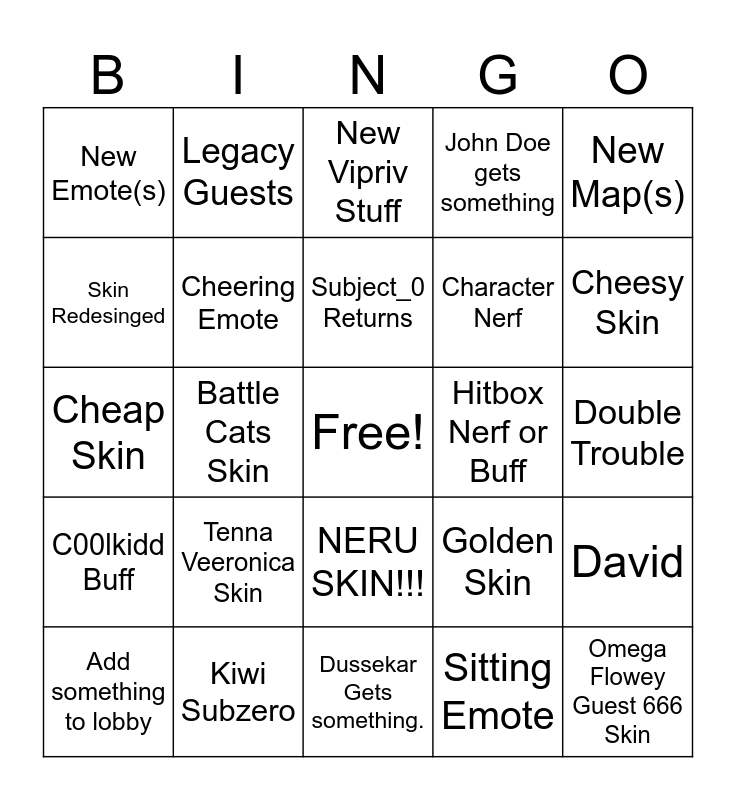 This bingo card has a free space and 24 words: Tenna Veeronica Skin, Kiwi Subzero, Subject_0 Returns, Add something to lobby, New Map(s), New Emote(s), Skin Redesinged, Legacy Guests, Hitbox Nerf or Buff, NERU SKIN!!!, Character Nerf, Cheap Skin, Golden Skin, David, Cheering Emote, Sitting Emote, Double Trouble, New Vipriv Stuff, Cheesy Skin, Battle Cats Skin, Omega Flowey Guest 666 Skin, C00lkidd Buff, John Doe gets something and Dussekar Gets something..