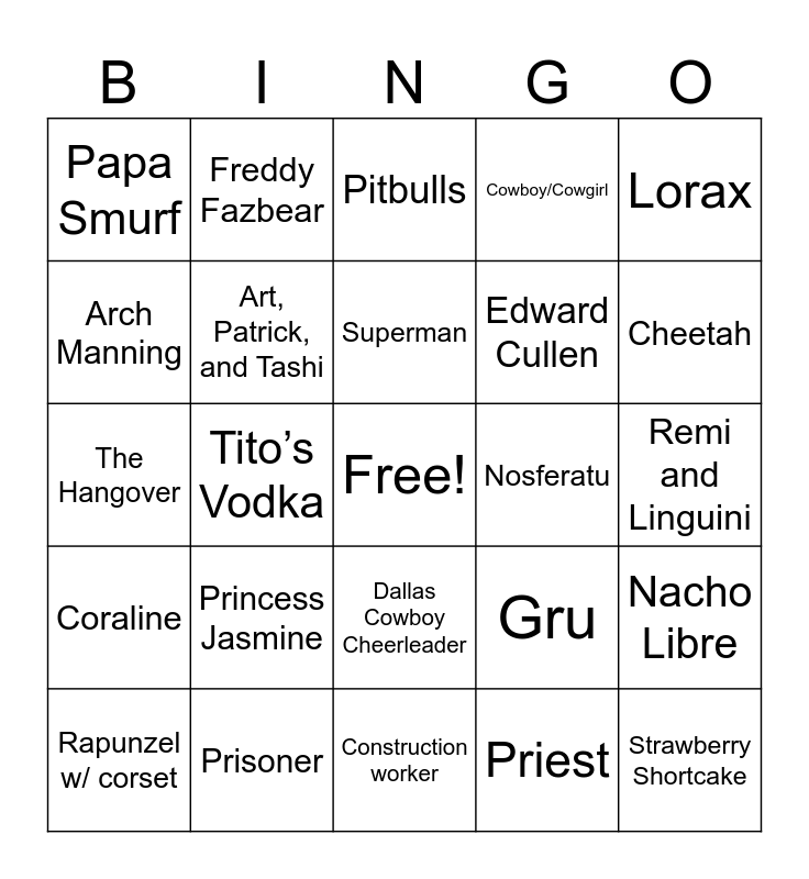 This bingo card has a free space and 24 words: Princess Jasmine, Prisoner, Superman, Rapunzel w/ corset, Lorax, Papa Smurf, Arch Manning, Freddy Fazbear, Nosferatu, Dallas Cowboy Cheerleader, Edward Cullen, The Hangover, Gru, Nacho Libre, Art, Patrick, and Tashi, Priest, Remi and Linguini, Pitbulls, Cheetah, Tito’s Vodka, Strawberry Shortcake, Coraline, Cowboy/Cowgirl and Construction worker.