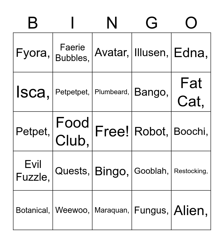 This bingo card has a free space and 78 words: Basic,, Battledome,, Avatar,, Faerieland,, Meridell,, Roo Island,, Jelly World,, The Giant Omelette,, Scratch Cards,, Snowager,, Tombola,, Jhudora,, Illusen,, Fyora,, Rainbow Fountain,, Isca,, Lavaling,, Quests,, The Esophagor,, Boochi,, The Brain Tree,, Edna,, Petpet,, Plumbeard,, Petpetpet,, Wheel of Excitement,, Wheel of Misfortune,, Chiazilla,, Wheel of Mediocrity,, Zap,, Fat Cat,, Kadoatie,, Maraquan,, Plushie,, Botanical,, Robot,, Chocolate,, Birthday,, Valentine,, Alien,, Baby,, Relics,, Sutek's Tomb,, Carnival of Terror,, Ice Cream Machine,, Faerie Bubbles,, Extreme Herder,, The Three,, Nerkmid,, Neocola Token,, Restocking,, Food Club,, Gooblah,, Puffo,, High Score Table,, Dubloon,, Codestone,, Merry Go Round,, Gardening,, Bingo,, Bango,, Advert Attack,, Dubloon Disaster,, Better Than You,, World Challenge,, Super Attack Pea,, Flizzardo,, Fish Negg,, Evil Fuzzle,, Weewoo,, Chickens,, Samurai Pizza Cats,, Bees,, Potatoes,, Fungus,, Tigersquash,, Zeenana, and Insomnia,.
