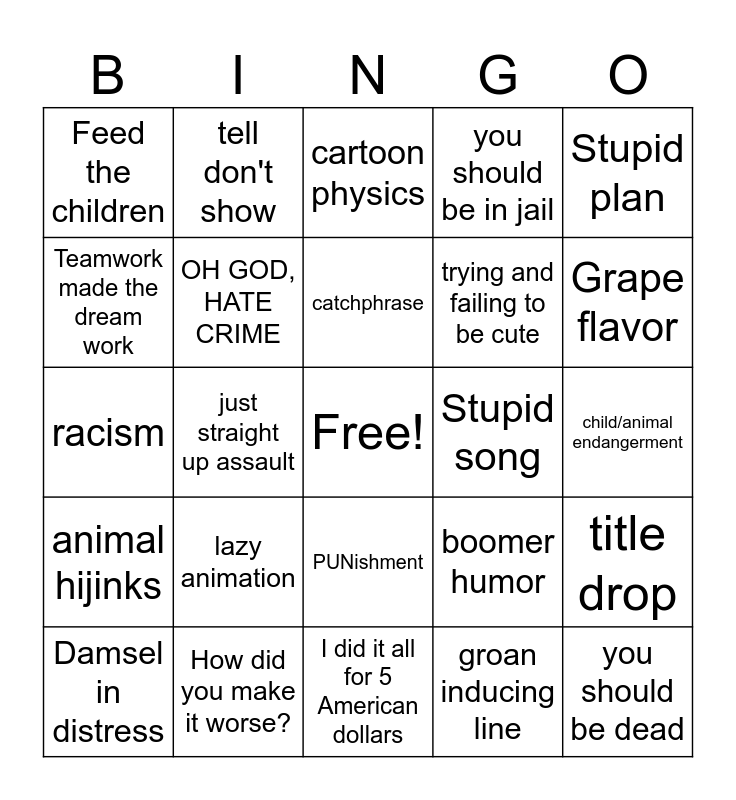 This bingo card has a free space and 40 words: Misogyny, racism, RACISM, OH GOD, HATE CRIME, How did you make it worse?, PUNishment, catchphrase, split up, Stupid plan, animal hijinks, just straight up assault, you should be in jail, you should be dead, child/animal endangerment, Stupid song, lazy animation, THE EYES!, Feed the children, keeping it in the family, cartoon physics, title drop, groan inducing line, trying and failing to be cute, Teamwork made the dream work, but why though, learn a lesson, extra cheese moment, Red flag, Garden variety incompetence, Impressive incompetence, authority figures are useless, Damsel in distress, body shaming, boomer humor, Grape flavor, I did it all for 5 American dollars, crying physicist, grape flavor, tell don't show and well that's convenient.