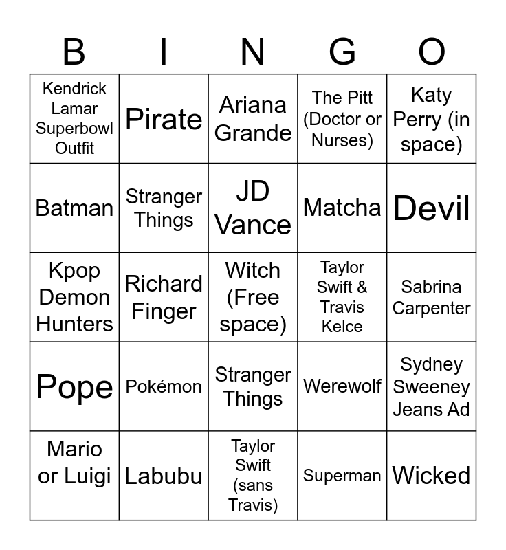 This bingo card has a free space and 41 words: Coldplay Couple, Kpop Demon Hunters, Sinners (vintage vampires), Stranger Things, Labubu, Stranger Things, JD Vance, Bad Bunny, Katy Perry (in space), Pope, Richard Finger, The Pitt (Doctor or Nurses), Wicked, Sabrina Carpenter, Taylor Swift & Travis Kelce, Pokémon, Pedro Pascal, Kendrick Lamar Superbowl Outfit, Lil Nas X (underwear & cowboy boots), Ariana Grande, Sydney Sweeney Jeans Ad, White Lotus, Taylor Swift (sans Travis), Matcha, Cat, Zombie, Superman, Skeleton, Devil, Angel, Ghost, Pirate, Mario or Luigi, Banana, Werewolf, Batman, Wednesday Addams, Pumpkin, Nightmare Before Christmas, Alice in Wonderland (any character) and Star Wars.