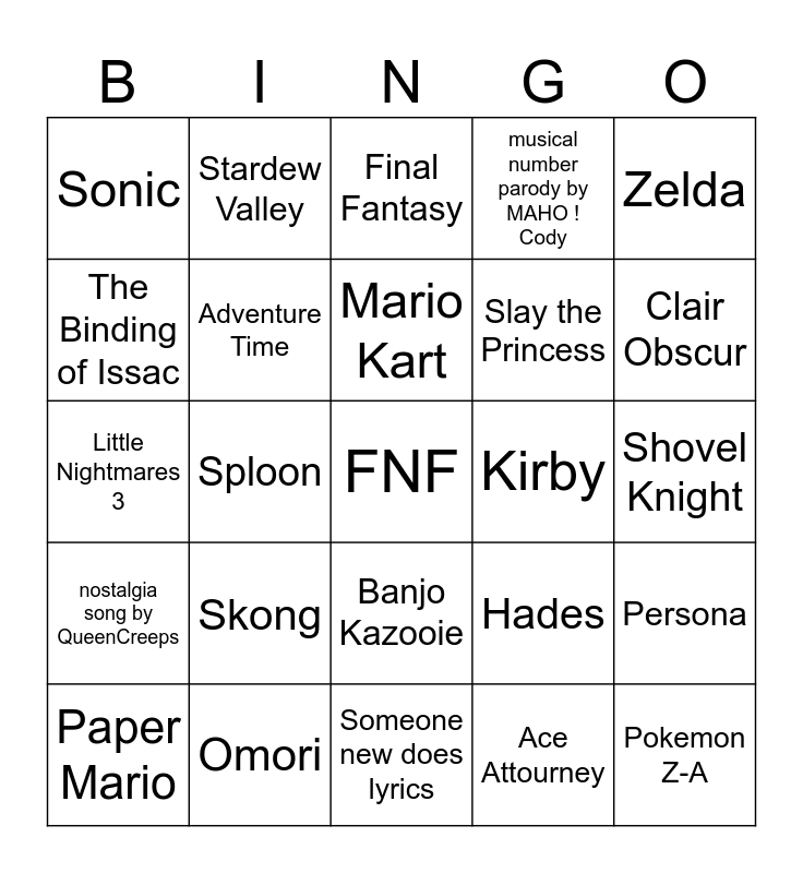 This bingo card has a free space and 24 words: Skong, Omori, Mario Kart, Paper Mario, Zelda, Sonic, The Binding of Issac, Stardew Valley, Kirby, Banjo Kazooie, Slay the Princess, Little Nightmares 3, Hades, Persona, Adventure Time, Ace Attourney, Shovel Knight, Final Fantasy, Clair Obscur, Sploon, Pokemon Z-A, nostalgia song by QueenCreeps, musical number parody by MAHO ! Cody and Someone new does lyrics.