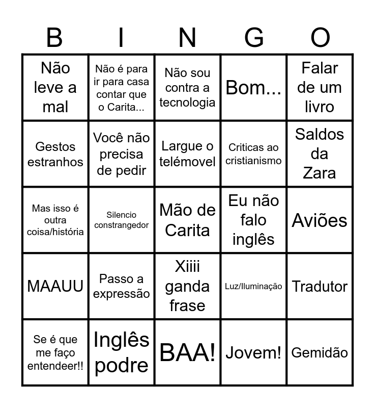 This bingo card has a free space and 24 words: Passo a expressão, Inglês podre, Largue o telémovel, Se é que me faço entendeer!!, Falar de um livro, Não leve a mal, Gestos estranhos, Não é para ir para casa contar que o Carita..., Eu não falo inglês, Xiiii ganda frase, Criticas ao cristianismo, Mas isso é outra coisa/história, Luz/Iluminação, Tradutor, Você não precisa de pedir, Jovem!, Aviões, Não sou contra a tecnologia, Saldos da Zara, Silencio constrangedor, Gemidão, MAAUU, Bom... and BAA!.