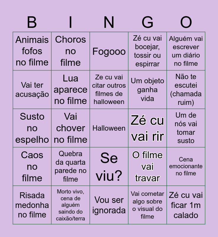 This bingo card has a free space and 24 words: Quebra da quarta parede no filme, Morto vivo, cena de alguém saindo do caixão/terra, Ze cu vai citar outros filmes de halloween, Risada medonha no filme, Alguém vai escrever um diário no filme, Animais fofos no filme, Vai ter acusação, Choros no filme, Zé cu vai rir, Se viu?, Um objeto ganha vida, Susto no espelho, O filme vai travar, Cena emocionante no filme, Lua aparece no filme, Vai cometar algo sobre o visual do filme, Um de nós vai tomar susto, Fogooo, Não te escutei (chamada ruim), Vai chover no filme, Zé cu vai ficar 1m calado, Caos no filme, Zé cu vai bocejar, tossir ou espirrar and Vou ser ignorada.