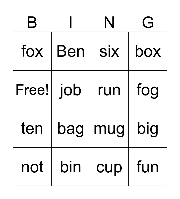 This bingo card has 16 words: bin, big, six, fox, ten, Ben, mug, cup, Free!, job, not, box, bag, fog, run and fun.