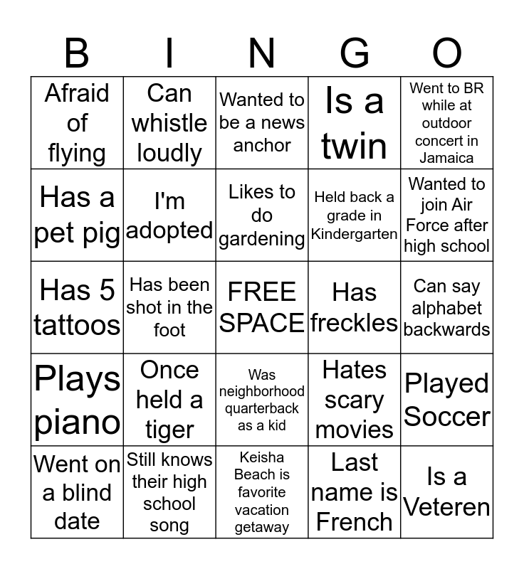 This bingo card has a free space and 24 words: Once held a tiger, Still knows their high school song, Likes to do gardening, Went on a blind date, Went to BR while at outdoor concert in Jamaica, Afraid of flying, Has a pet pig, Can whistle loudly, Has freckles, Was neighborhood quarterback as a kid, Held back a grade in Kindergarten, Has 5 tattoos, Hates scary movies, Played Soccer, I'm adopted, Last name is French, Can say alphabet backwards, Wanted to be a news anchor, Wanted to join Air Force after high school, Has been shot in the foot, Is a Veteren, Plays piano, Is a twin and Keisha Beach is favorite vacation getaway.