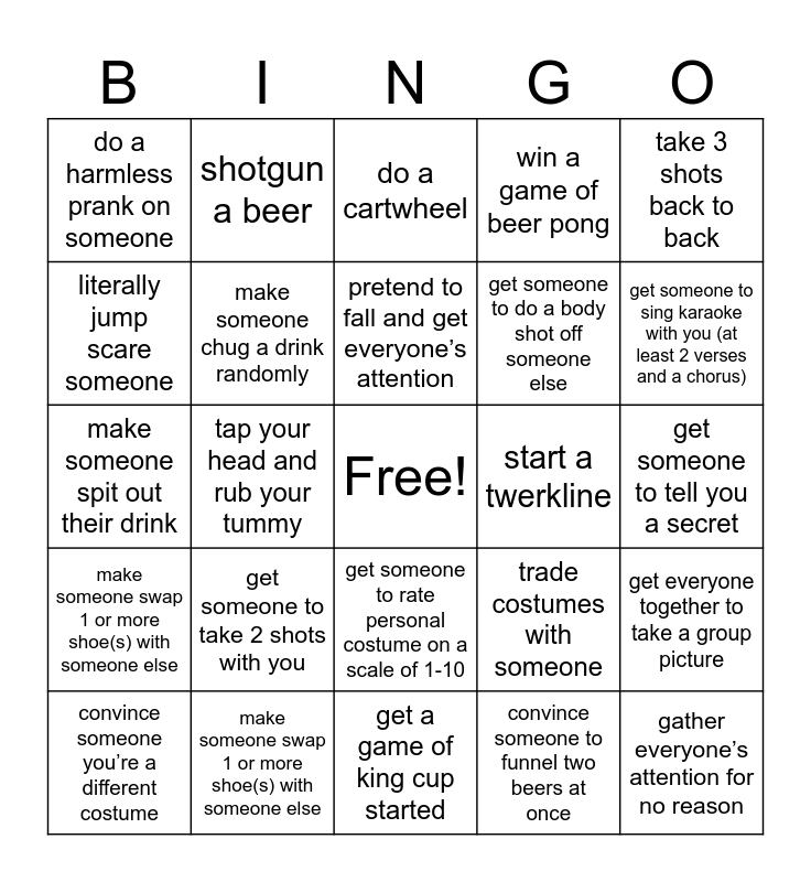 This bingo card has a free space and 24 words: get someone to take 2 shots with you, make someone swap 1 or more shoe(s) with someone else, pretend to fall and get everyone’s attention, convince someone you’re a different costume, take 3 shots back to back, do a harmless prank on someone, literally jump scare someone, shotgun a beer, start a twerkline, get someone to rate personal costume on a scale of 1-10, get someone to do a body shot off someone else, make someone spit out their drink, trade costumes with someone, get everyone together to take a group picture, make someone chug a drink randomly, convince someone to funnel two beers at once, get someone to tell you a secret, do a cartwheel, get someone to sing karaoke with you (at least 2 verses and a chorus), tap your head and rub your tummy, gather everyone’s attention for no reason, make someone swap 1 or more shoe(s) with someone else, win a game of beer pong and get a game of king cup started.