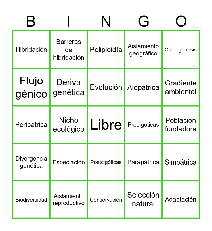 This bingo card has a free space and 24 words: Especiación, Aislamiento reproductivo, Evolución, Biodiversidad, Cladogénesis, Hibridación, Flujo génico, Barreras de hibridación, Precigóticas, Postcigóticas, Alopátrica, Peripátrica, Parapátrica, Simpátrica, Deriva genética, Selección natural, Población fundadora, Poliploidía, Gradiente ambiental, Nicho ecológico, Adaptación, Divergencia genética, Aislamiento geográfico and Conservación.