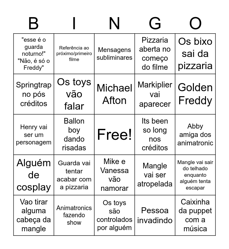 This bingo card has a free space and 25 words: Guarda vai tentar acabar com a pizzaria, Os toys são controlados por alguém, Michael Afton, Vao tirar alguma cabeça da mangle, Os bixo sai da pizzaria, "esse é o guarda noturno!" "Não, é só o Freddy", Springtrap no pós créditos, Referência ao próximo/primeiro filme, Its been so long nos créditos, Mike e Vanessa vão namorar, Markiplier vai aparecer, Henry vai ser um personagem, Mangle vai ser atropelada, Mangle vai sair do telhado enquanto alguém tenta escapar, Os toys vão falar, Toy bonnie estúpido, Abby amiga dos animatronic, Mensagens subliminares, Golden Freddy, Ballon boy dando risadas, Caixinha da puppet com a música, Animatronics fazendo show, Alguém de cosplay, Pizzaria aberta no começo do filme and Pessoa invadindo.