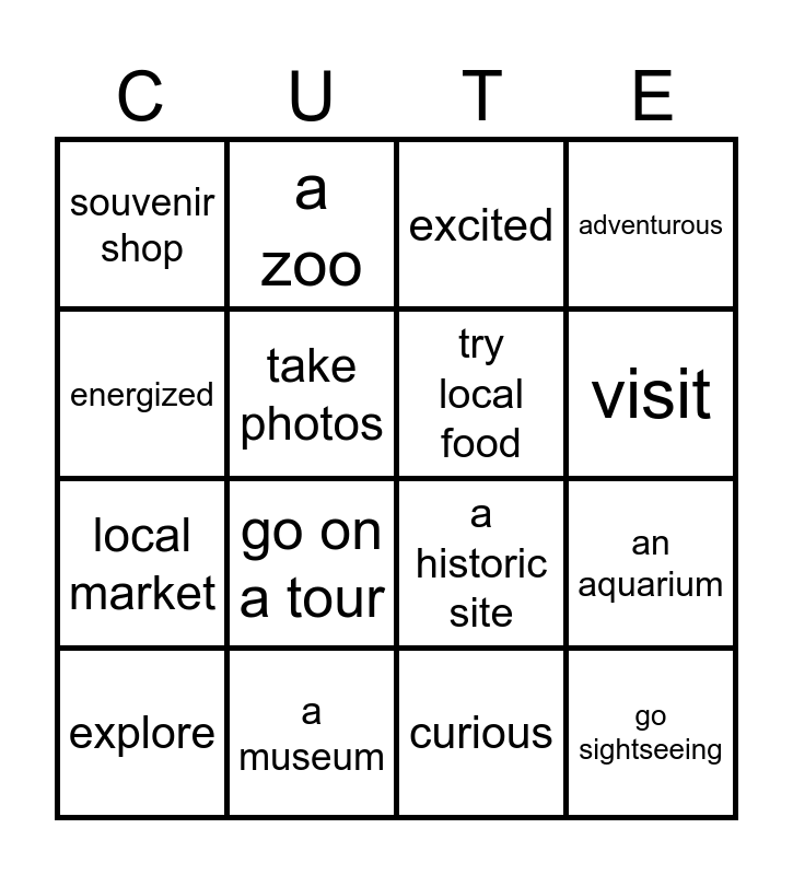 This bingo card has 16 words: a museum, an aquarium, excited, souvenir shop, local market, a zoo, a historic site, curious, energized, take photos, explore, adventurous, go on a tour, visit, try local food and go sightseeing.