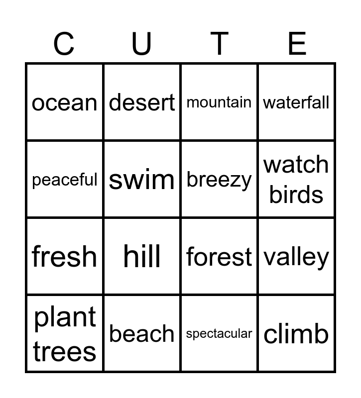 This bingo card has 16 words: beach, valley, mountain, ocean, fresh, desert, forest, spectacular, peaceful, swim, plant trees, waterfall, hill, watch birds, breezy and climb.