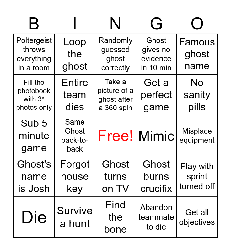 This bingo card has a free space and 29 words: Die, Instant Demon Hunt, Same Ghost back-to-back, Die trying to find bone, Poltergeist throws everything in a room, Randomly guessed ghost correctly, Entire team dies, Forgot house key, Mimic, Survive a hunt, Misplace equipment, Get all objectives, Find the bone, Abandon teammate to die, No sanity pills, Get startled, Ghost turns on TV, Ghost's name is Josh, Famous ghost name, Sub 5 minute game, Ghost burns crucifix, Spiritbox, Get a perfect game, Fill the photobook with 3* photos only, Ghost gives no evidence in 10 min, Loop the ghost, Play with sprint turned off, Take a picture of a ghost after a 360 spin and Complete a full game of Jenga.
