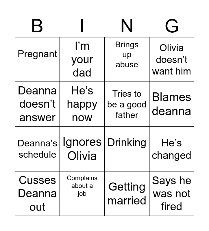 This bingo card has 16 words: Complains about a job, He’s changed, Brings up abuse, Pregnant, Deanna’s schedule, I’m your dad, Drinking, Getting married, Deanna doesn’t answer, He’s happy now, Cusses Deanna out, Olivia doesn’t want him, Ignores Olivia, Blames deanna, Tries to be a good father and Says he was not fired.