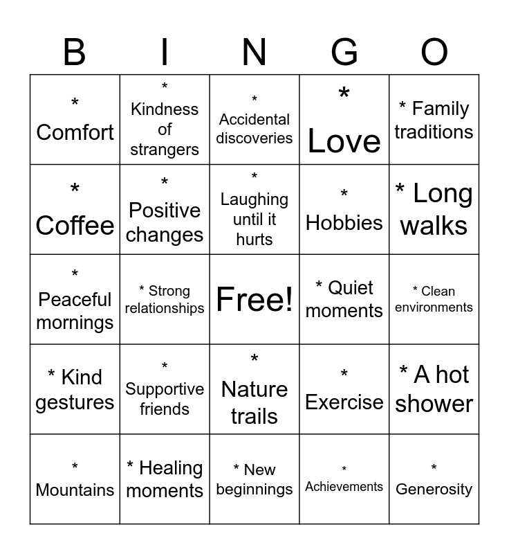 This bingo card has a free space and 92 words: * Family, * Friends, * Health, * A safe home, * Food, * Water, * Sunshine, * Laughter, * Nature, * Dogs, * Cats, * Good books, * Music, * Hobbies, * Experiences, * Comfort, * Kindness of strangers, * Lively conversations, * Inspirational people, * Learning new things, * Good memories, * Artistic expression, * Traveling, * Warm blankets, * A hot shower, * Coffee, * Tea, * Fresh air, * Beautiful sunsets, * The ocean, * Mountains, * Supportive friends, * Moments of peace, * Achievements, * Family traditions, * Fresh fruits, * A comfortable bed, * Local community, * Love, * Generosity, * Kind gestures, * Strong relationships, * Nature trails, * Exercise, * Clean environments, * Creativity, * Opportunities, * Safety, * Empathy, * Sense of humor, * Pets, * Kindred spirits, * Handwritten letters, * Memories with loved ones, * Smiles from strangers, * Cooking, * Gardening, * New beginnings, * Forgiveness, * Long walks, * Warm weather, * Recovery Church, * Sobriety, * Soft pillows, * Inspiring quotes, * Celebrations, * Achievements of others, * Nature's beauty, * Good sleep, * Acts of kindness, * The seasons changing, * Family reunions, * Laughing until it hurts, * Quiet moments, * Learning from mistakes, * Afternoon naps, * Healing moments, * Support networks, * Inspirational books, * Life lessons, * Memories of vacations, * Positive changes, * Accidental discoveries, * Learning new skills, * Acts of love, * Beautiful art, * The ability to dream, * Small victories, * Acts of bravery, * Quality time, * Peaceful mornings and * The gift of today.