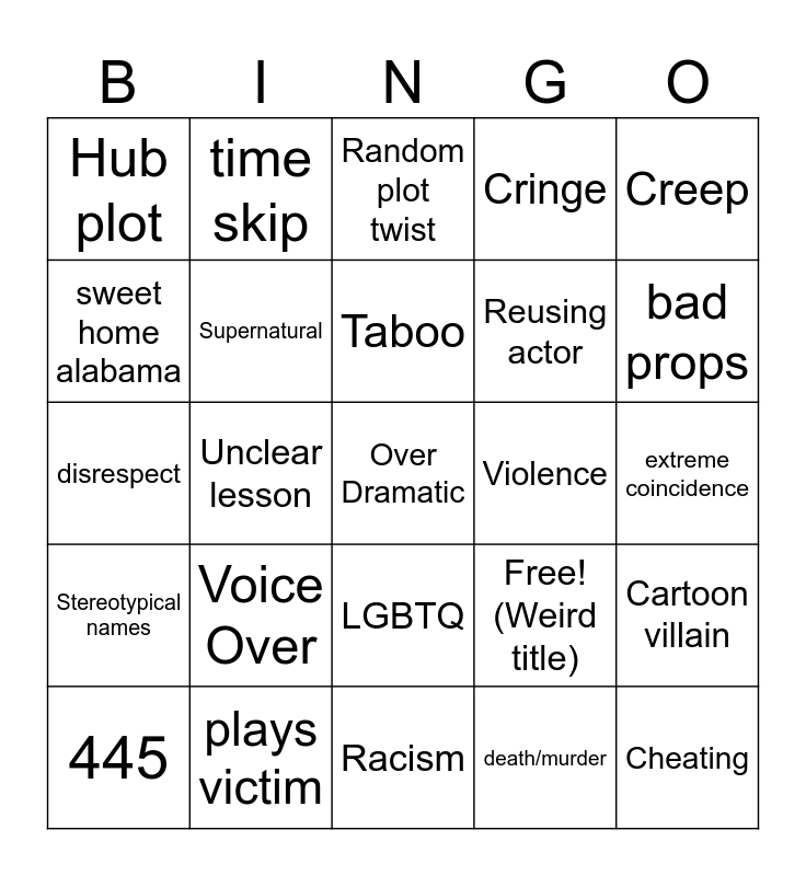 This bingo card has 25 words: Voice Over, Racism, Taboo, 445, Creep, Hub plot, sweet home alabama, time skip, Violence, LGBTQ, Reusing actor, disrespect, Free! (Weird title), Cartoon villain, Supernatural, Cheating, extreme coincidence, Random plot twist, bad props, Unclear lesson, Over Dramatic, plays victim, Stereotypical names, Cringe and death/murder.