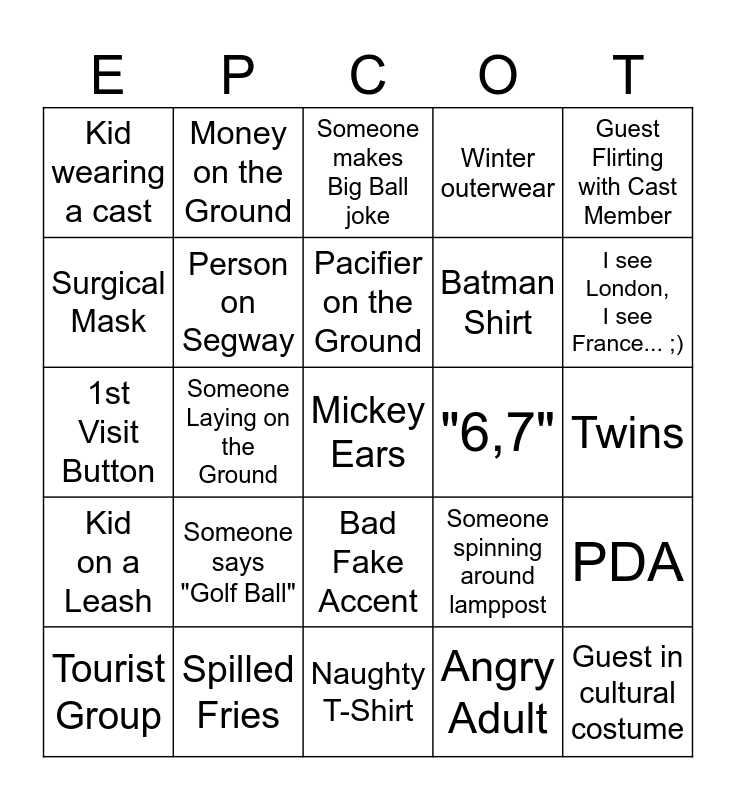 This bingo card has a free space and 24 words: Someone says "Golf Ball", Spilled Fries, Pacifier on the Ground, Tourist Group, Guest Flirting with Cast Member, Kid wearing a cast, Surgical Mask, Money on the Ground, "6,7", Bad Fake Accent, Batman Shirt, 1st Visit Button, Someone spinning around lamppost, PDA, Person on Segway, Angry Adult, Twins, Someone makes Big Ball joke, I see London, I see France... ;), Someone Laying on the Ground, Guest in cultural costume, Kid on a Leash, Winter outerwear and Naughty T-Shirt.