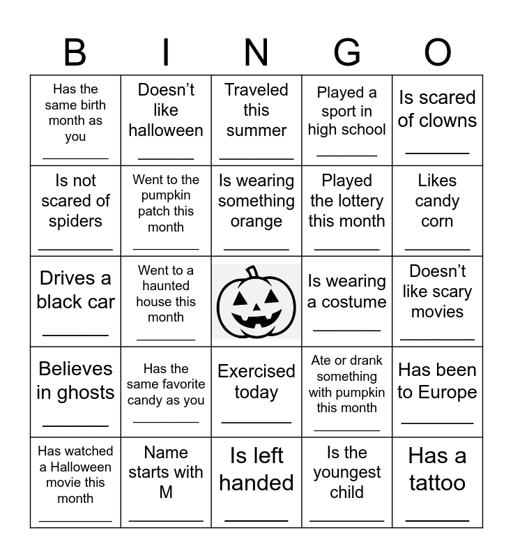 This bingo card has a free space and 24 words: Has the same favorite candy as you _________, Name starts with M ________, Is wearing something orange _______, Has watched a Halloween movie this month __________, Is scared of clowns ______, Has the same birth month as you _________, Is not scared of spiders ________, Doesn’t like halloween ______, Is wearing a costume _______, Exercised today _______, Played the lottery this month _______, Drives a black car ______, Ate or drank something with pumpkin this month _________, Has been to Europe _______, Went to the pumpkin patch this month _________, Is the youngest child ________, Doesn’t like scary movies ________, Traveled this summer ________, Likes candy corn _______, Went to a haunted house this month ________, Has a tattoo _____, Believes in ghosts ______, Played a sport in high school _______ and Is left handed _____.
