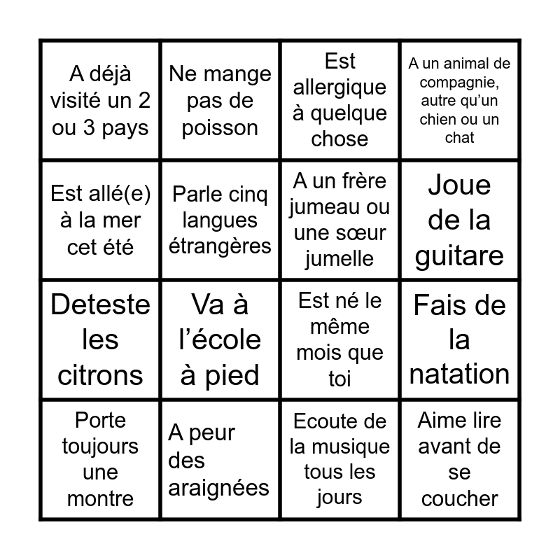 This bingo card has 16 words: A peur des araignées, Fais de la natation, Est allergique à quelque chose, A déjà visité un 2 ou 3 pays, Deteste les citrons, Ne mange pas de poisson, Est né le même mois que toi, Ecoute de la musique tous les jours, Est allé(e) à la mer cet été, Parle cinq langues étrangères, Porte toujours une montre, A un animal de compagnie, autre qu’un chien ou un chat, Va à l’école à pied, Joue de la guitare, A un frère jumeau ou une sœur jumelle and Aime lire avant de se coucher.
