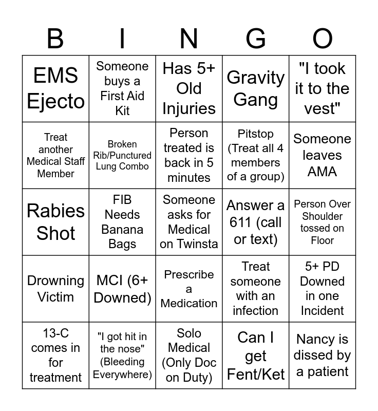This bingo card has a free space and 24 words: MCI (6+ Downed), "I got hit in the nose" (Bleeding Everywhere), Person treated is back in 5 minutes, 13-C comes in for treatment, "I took it to the vest", EMS Ejecto, Treat another Medical Staff Member, Someone buys a First Aid Kit, Answer a 611 (call or text), Prescribe a Medication, Pitstop (Treat all 4 members of a group), Rabies Shot, Treat someone with an infection, 5+ PD Downed in one Incident, Broken Rib/Punctured Lung Combo, Can I get Fent/Ket, Person Over Shoulder tossed on Floor, Has 5+ Old Injuries, Someone leaves AMA, FIB Needs Banana Bags, Nancy is dissed by a patient, Drowning Victim, Gravity Gang and Solo Medical (Only Doc on Duty).