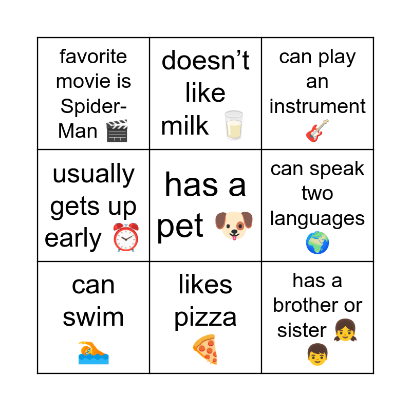 This bingo card has 9 words: can swim π, can play an instrument πΈ, doesnβt like milk π₯, usually gets up early β°, favorite movie is Spider-Man π¬, can speak two languages π, has a pet πΆ, has a brother or sister π§π¦ and likes pizza π.