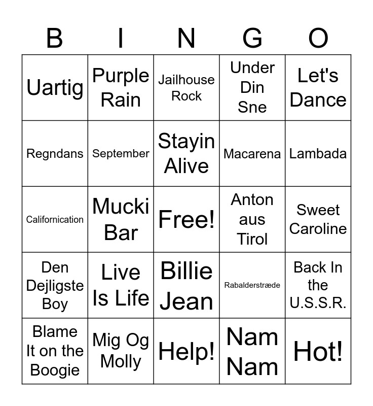 This bingo card has a free space and 39 words: A Hard Day's Night, Dancing Queen, Lady Madonna, September, Blame It on the Boogie, Billie Jean, Stayin Alive, Azizam, Let's Dance, Den Dejligste Boy, Mucki Bar, Under Din Sne, Hot!, Sweet Caroline, Anton aus Tirol, Live Is Life, Kom Tilbage Nu, Uartig, Sjæl i flammre, Rabalderstræde, Regndans, Help!, Macarena, Lambada, Personal Jesus, Malaga, Det Er Mig Der Står herude og banker på, Night Fever, Dance The Night, Purple Rain, Mød mig i mørket, Burning Love, Jailhouse Rock, Mig Og Molly, Nam Nam, Vilde Kaniner, Back In the U.S.S.R., Californication and Let Me Entertain You.