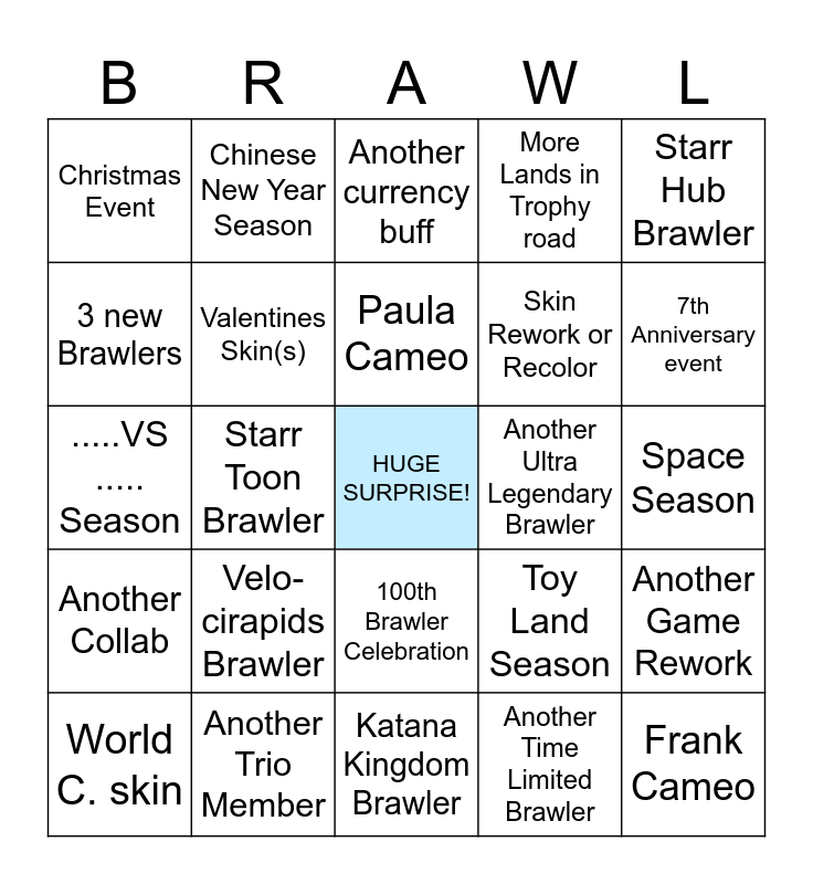 This bingo card has a free space and 24 words: Velo-cirapids Brawler, Another Trio Member, Paula Cameo, World C. skin, Starr Hub Brawler, Christmas Event, 3 new Brawlers, Chinese New Year Season, Another Ultra Legendary Brawler, 100th Brawler Celebration, Skin Rework or Recolor, .....VS ..... Season, Toy Land Season, Another Game Rework, Valentines Skin(s), Another Time Limited Brawler, Space Season, Another currency buff, 7th Anniversary event, Starr Toon Brawler, Frank Cameo, Another Collab, More Lands in Trophy road and Katana Kingdom Brawler.