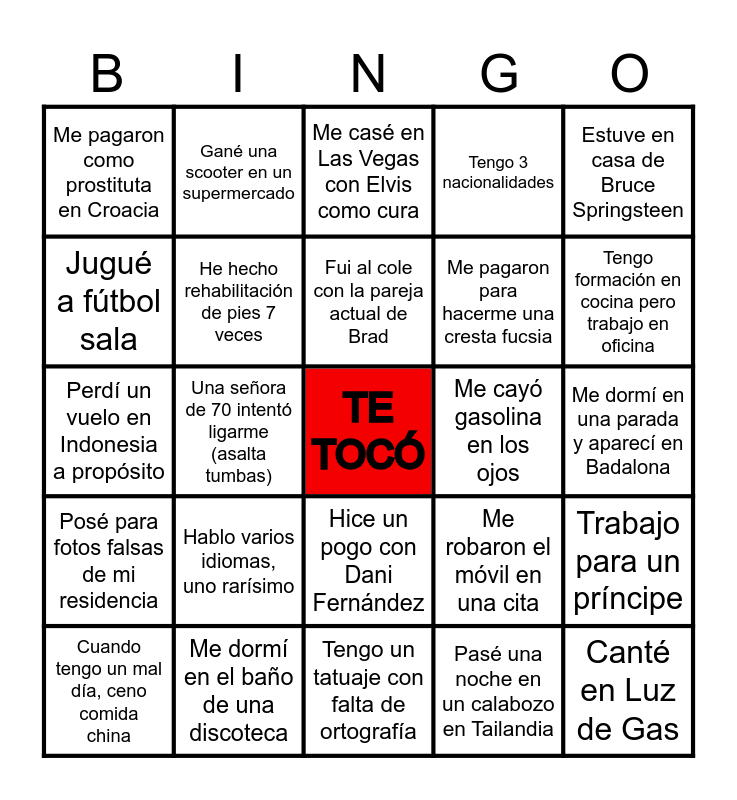 This bingo card has a free space and 32 words: Pasé una noche en un calabozo en Tailandia, He perdido mi cartera 5 veces este año, Una señora de 70 intentó ligarme (asalta tumbas), He vivido en 3 países, Posé para fotos falsas de mi residencia, He hecho rehabilitación de pies 7 veces, Estuve en casa de Bruce Springsteen, Trabajo para un príncipe, Gané una scooter en un supermercado, He cantado en varios discos, Fui al cole con la pareja actual de Brad, Me casé en Las Vegas con Elvis como cura, Me gusta el tiramisù con zumo de piña, Dejé mis llaves en la nevera, Me cayó gasolina en los ojos, La única vez que jugué al póker, perdí la memoria, Cuando tengo un mal día, ceno comida china, Perdí un vuelo en Indonesia a propósito, Hice un pogo con Dani Fernández, Hablo varios idiomas, uno rarísimo, Me robaron el móvil en una cita, Me he dormido caminando volviendo de fiesta, Me dormí en una parada y aparecí en Badalona, Me dormí en el baño de una discoteca, Canté en Luz de Gas, Tengo 3 nacionalidades, Me pagaron para hacerme una cresta fucsia, Jugué a fútbol sala, Me pagaron como prostituta en Croacia, Tengo un tatuaje con falta de ortografía, Soy profe de castellano and Tengo formación en cocina pero trabajo en oficina.