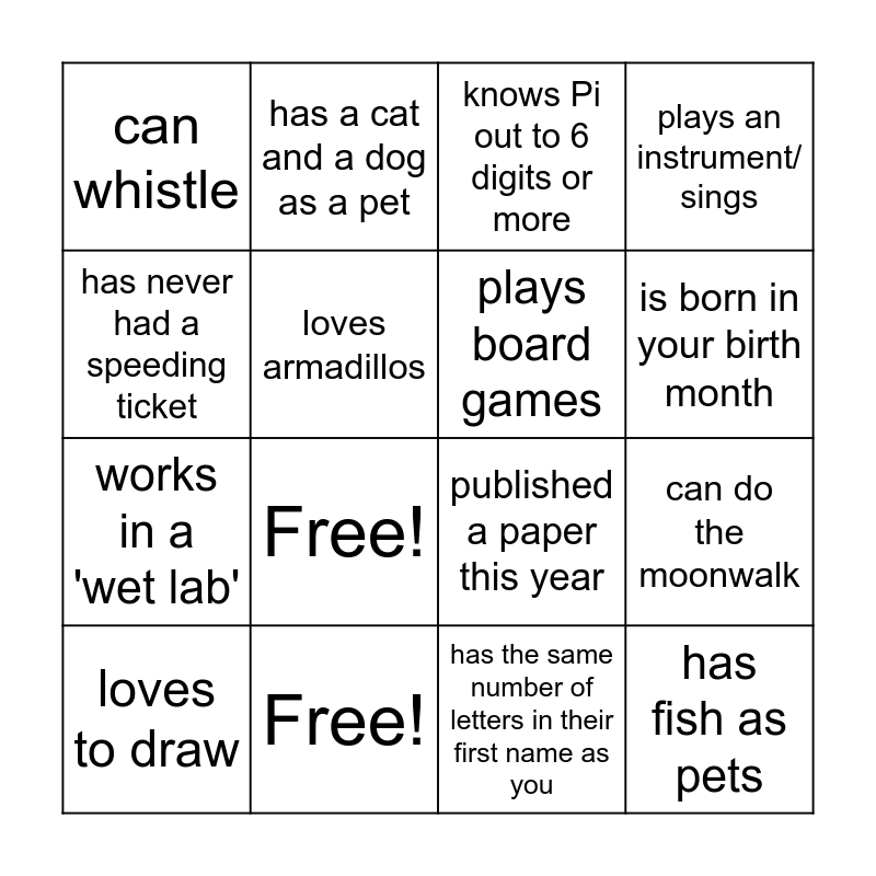 This bingo card has 24 words: is in your field of science, name starts with same letter of your last name, is born in your birth month, prefers tea over coffee, has never had a speeding ticket, can whistle, loves armadillos, has a cat and a dog as a pet, Free!, has a bird as a pet, works in a 'wet lab', published a paper this year, hates chocolate, is a couch potato, plays board games, loves to dance, has the same number of letters in their first name as you, knows Pi out to 6 digits or more, Free!, can do the moonwalk, loves to draw, has fish as pets, plays an instrument/ sings and loves hiking.