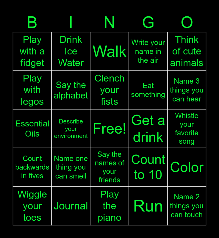 This bingo card has a free space and 39 words: Take 3 deep breaths, Name 5 things you can see, Lay under a weighted blanket, Say the alphabet, Wiggle your toes, Say the names of your friends, Clench your fists, Starfish pose, Think of cute animals, Count backwards in fives, Describe your environment, Write your name in the air, Name 2 things you can touch, Whistle your favorite song, Get a drink, Name one thing you can smell, Say the names of your family members, Play with a fidget, Do a puzzle, Count to 10, Play with legos, Play the piano, Eat something, Name 3 things you can hear, Sour Candy, Ice Packs, Stand on the grass, Hug a Tree, Listen to music, Drink Ice Water, Body Scan, Tapping, Walk, Journal, Run, Draw, Color, Essential Oils and DON'T ISOLATE.