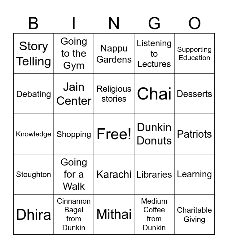 This bingo card has a free space and 47 words: Fruits, Charitable Giving, Baked Goods, Mithai, Going for a Walk, Grandkids, Going to the Gym, Naps, Debating, Pav Bhaiji BBQ, Jain Center, Listening to Lectures, Learning, Libraries, The Press, Explaining Jain Principles, Religious stories, Dunkin Donuts, Coffee Shops, Supporting Education, Shopping, Medium Coffee from Dunkin, Story Telling, Chai, Engineering, Desserts, Dhira, Sweets, Karachi, Stoughton, Weighted Vest Walking, Donating, Matunga, Biscotti, Time with Friends, Cinnamon Bagel from Dunkin, Patriots, The Mall, Ice Cream, Time with Family, Kaushik Nivas, Nappu Gardens, Knowledge, Helping others, Walking in the Mall, Going to the Movies and Lowell University.