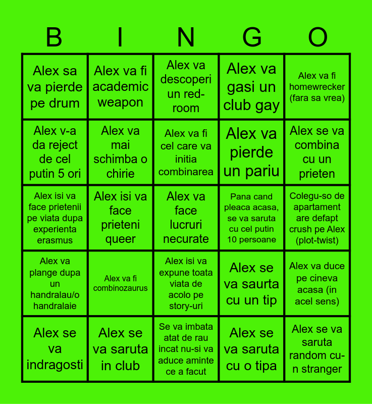 This bingo card has a free space and 24 words: Alex va fi combinozaurus, Alex se va saruta in club, Alex va fi cel care va initia combinarea, Alex se va indragosti, Alex va fi homewrecker (fara sa vrea), Alex sa va pierde pe drum, Alex v-a da reject de cel putin 5 ori, Alex va fi academic weapon, Pana cand pleaca acasa, se va saruta cu cel putin 10 persoane, Alex isi va expune toata viata de acolo pe story-uri, Alex va pierde un pariu, Alex isi va face prietenii pe viata dupa experienta erasmus, Alex se va saurta cu un tip, Alex va duce pe cineva acasa (in acel sens), Alex va mai schimba o chirie, Alex se va saruta cu o tipa, Colegu-so de apartament are defapt crush pe Alex (plot-twist), Alex va descoperi un red-room, Alex se va combina cu un prieten, Alex isi va face prieteni queer, Alex se va saruta random cu-n stranger, Alex va plange dupa un handralau/o handralaie, Alex va gasi un club gay and Se va imbata atat de rau incat nu-si va aduce aminte ce a facut.