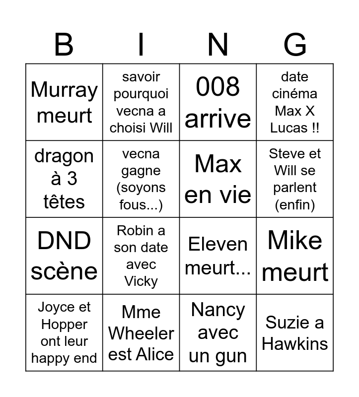 This bingo card has 16 words: Mme Wheeler est Alice, Mike meurt, 008 arrive, Murray meurt, DND scène, savoir pourquoi vecna a choisi Will, Eleven meurt..., Nancy avec un gun, dragon à 3 têtes, vecna gagne (soyons fous...), Joyce et Hopper ont leur happy end, date cinéma Max X Lucas !!, Robin a son date avec Vicky, Steve et Will se parlent (enfin), Max en vie and Suzie a Hawkins.