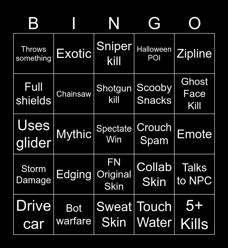 This bingo card has a free space and 24 words: Edging, Bot warfare, Shotgun kill, Drive car, Zipline, Throws something, Full shields, Exotic, Crouch Spam, FN Original Skin, Scooby Snacks, Uses glider, Collab Skin, Talks to NPC, Chainsaw, Touch Water, Emote, Sniper kill, Ghost Face Kill, Mythic, 5+ Kills, Storm Damage, Halloween POI and Sweat Skin.