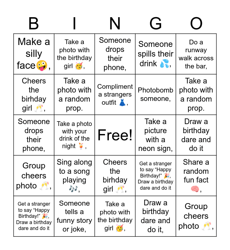This bingo card has a free space and 70 words: Dance to the song playing π, Draw a birthday dare and do it, Sing happy birthday π€,, Take a selfie w/ the bartender πΈ,, Someone tells a funny story or joke,, Draw a birthday dare and do it,, Someone spills their drink π¦,, Take a photo with the birthday girl π₯³,, Do a runway walk across the bar,, Compliment a strangers outfit π,, Share a random fun fact π§ ,, β a stranger,, Make a silly faceπ€ͺ,, Someone drops their phone,, Someone mentions work,, Take a photo with your drink of the night πΉ,, Cheers the birhday girl π₯,, Photobomb someone,, Sing along to a song playing πΆ,, Group cheers photo π₯,, Take a picture with a neon sign,, Get a stranger to say βHappy Birthday!β π, Draw a birthday dare and do it, Take a photo with a random prop., Dance to the song playing π, Draw a birthday dare and do it, Sing happy birthday π€,, Take a selfie w/ the bartender πΈ,, Someone tells a funny story or joke,, Draw a birthday dare and do it,, Someone spills their drink π¦,, Take a photo with the birthday girl π₯³,, Do a runway walk across the bar,, Compliment a strangers outfit π,, Share a random fun fact π§ ,, β a stranger,, Make a silly faceπ€ͺ,, Someone drops their phone,, Someone mentions work,, Take a photo with your drink of the night πΉ,, Cheers the birhday girl π₯,, Photobomb someone,, Sing along to a song playing πΆ,, Group cheers photo π₯,, Take a picture with a neon sign,, Get a stranger to say βHappy Birthday!β π, Draw a birthday dare and do it, Take a photo with a random prop., Get a stranger to say βHappy Birthday!β π, Draw a birthday dare and do it, Dance to the song playing π, Draw a birthday dare and do it, Sing happy birthday π€,, Take a selfie w/ the bartender πΈ,, Someone tells a funny story or joke,, Draw a birthday dare and do it,, Someone spills their drink π¦,, Take a photo with the birthday girl π₯³,, Do a runway walk across the bar,, Compliment a strangers outfit π,, Share a random fun fact π§ ,, β a stranger,, Make a silly faceπ€ͺ,, Someone drops their phone,, Someone mentions work,, Take a photo with your drink of the night πΉ,, Cheers the birhday girl π₯,, Photobomb someone,, Sing along to a song playing πΆ,, Group cheers photo π₯,, Take a picture with a neon sign,, Get a stranger to say βHappy Birthday!β π, Draw a birthday dare and do it and Take a photo with a random prop..