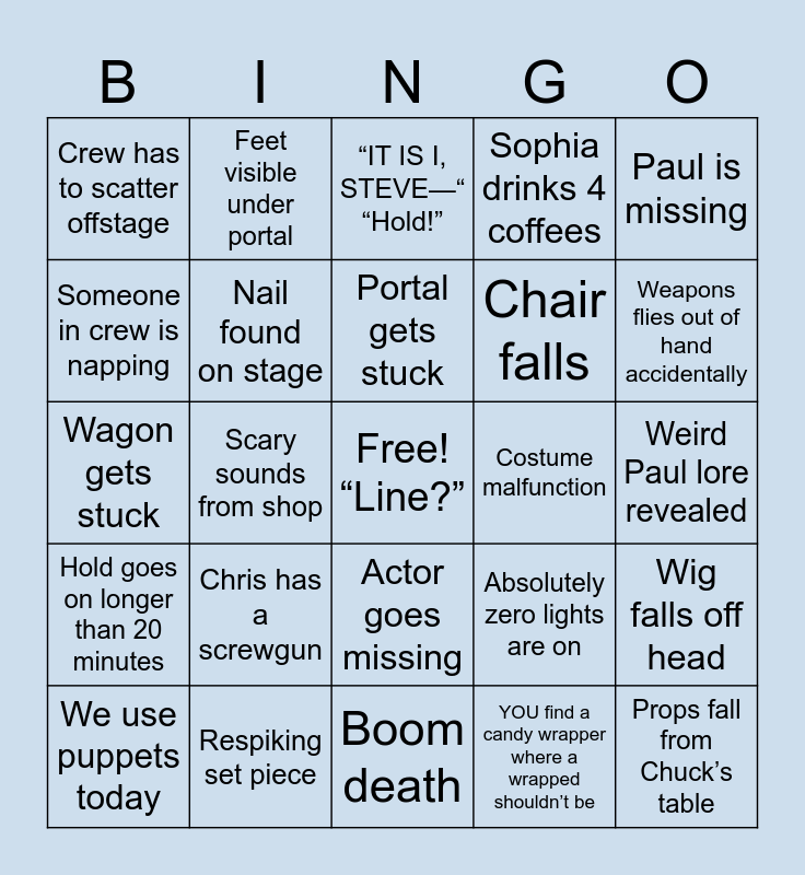 This bingo card has a free space and 24 words: Chris has a screwgun, Respiking set piece, Portal gets stuck, We use puppets today, Paul is missing, Crew has to scatter offstage, Someone in crew is napping, Feet visible under portal, Costume malfunction, Actor goes missing, Chair falls, Wagon gets stuck, Absolutely zero lights are on, Wig falls off head, Nail found on stage, YOU find a candy wrapper where a wrapped shouldn’t be, Weird Paul lore revealed, “IT IS I, STEVE—“ “Hold!”, Weapons flies out of hand accidentally, Scary sounds from shop, Props fall from Chuck’s table, Hold goes on longer than 20 minutes, Sophia drinks 4 coffees and Boom death.