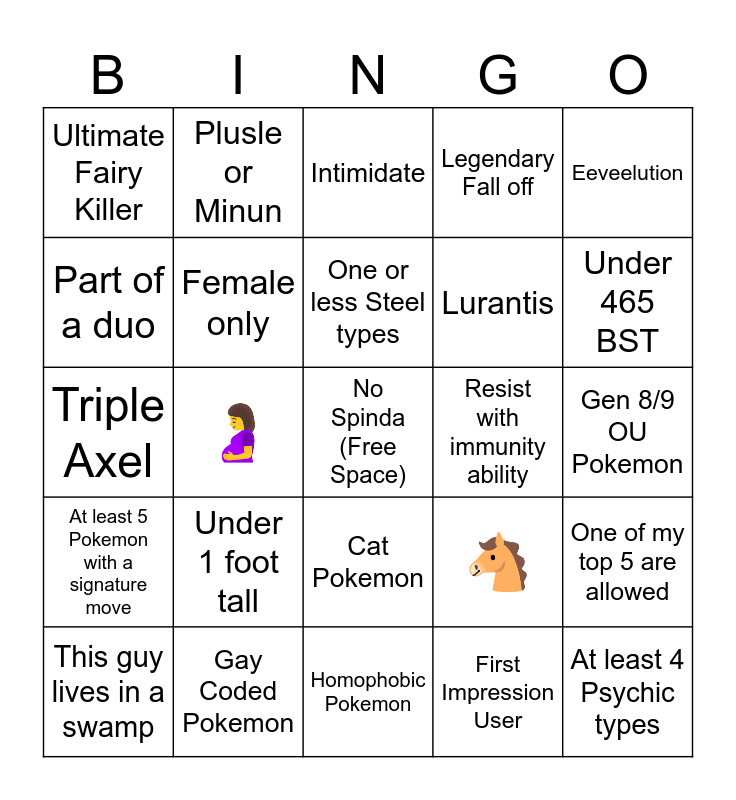 This bingo card has a free space and 24 words: This guy lives in a swamp, Under 1 foot tall, One or less Steel types, First Impression User, Eeveelution, Ultimate Fairy Killer, Plusle or Minun, Intimidate, Resist with immunity ability, Gen 8/9 OU Pokemon, Triple Axel, Female only, 🐴, One of my top 5 are allowed, Part of a duo, Gay Coded Pokemon, Homophobic Pokemon, Legendary Fall off, Under 465 BST, At least 5 Pokemon with a signature move, 🤰, Cat Pokemon, Lurantis and At least 4 Psychic types.