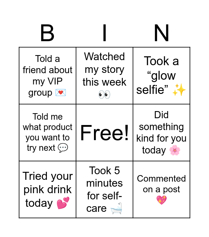 This bingo card has a free space and 9 words: Tried your pink drink today π, Took a βglow selfieβ β¨, Watched my story this week π, Told me what product you want to try next π¬, Told a friend about my VIP group π, Did something kind for you today πΈ, Commented on a post π, Added something new to your wish list π and Took 5 minutes for self-care π.