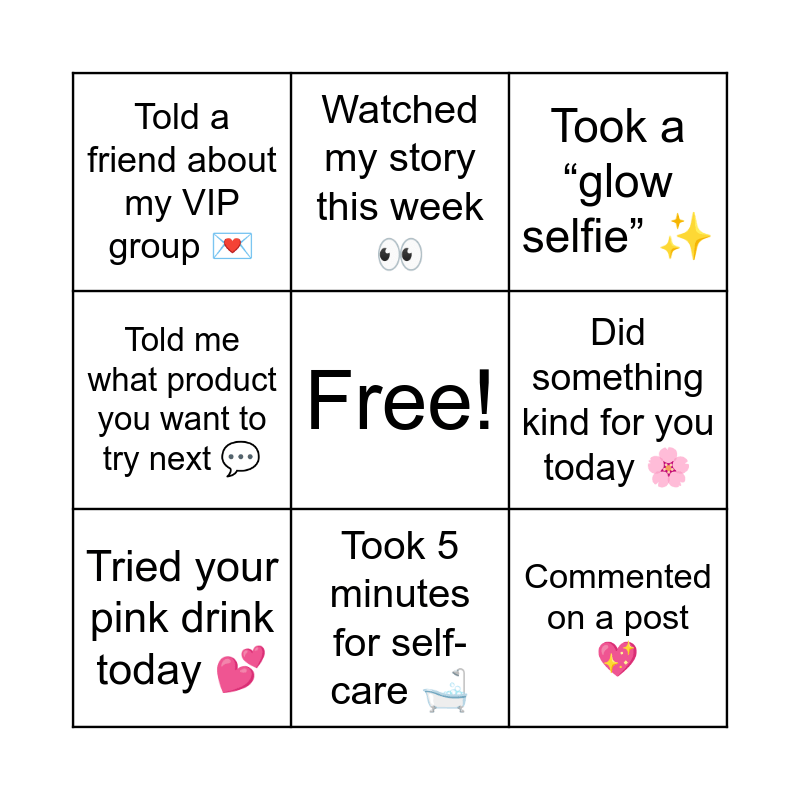 This bingo card has a free space and 9 words: Tried your pink drink today 💕, Took a “glow selfie” ✨, Watched my story this week 👀, Told me what product you want to try next 💬, Told a friend about my VIP group 💌, Did something kind for you today 🌸, Commented on a post 💖, Added something new to your wish list 🎁 and Took 5 minutes for self-care 🛁.