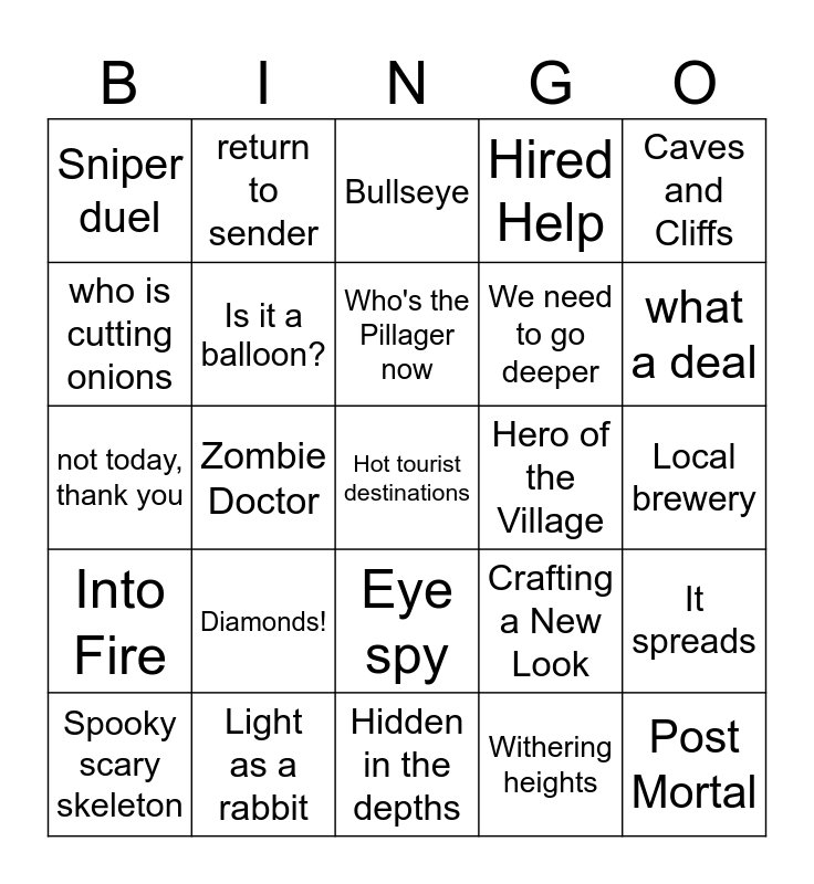 This bingo card has a free space and 24 words: Diamonds!, Light as a rabbit, Who's the Pillager now, Spooky scary skeleton, Caves and Cliffs, Sniper duel, who is cutting onions, return to sender, Hero of the Village, Eye spy, We need to go deeper, not today, thank you, Crafting a New Look, It spreads, Is it a balloon?, Withering heights, Local brewery, Bullseye, what a deal, Zombie Doctor, Post Mortal, Into Fire, Hired Help and Hidden in the depths.