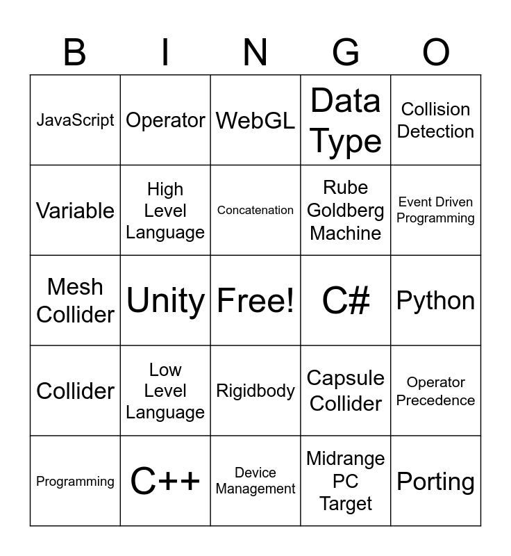 This bingo card has a free space and 29 words: Programming, Game Engine, Unity, Unreal Engine, JavaScript, WebGL, High Level Language, Low Level Language, C#, C++, Python, Porting, Device Management, Midrange PC Target, Event Driven Programming, Game Logic, Rigidbody, Collider, Collision Detection, Mesh Collider, Capsule Collider, Composite Collider 2D, Rube Goldberg Machine, Variable, Data Type, Operator, Operator Precedence, Concatenation and Debug.Log.
