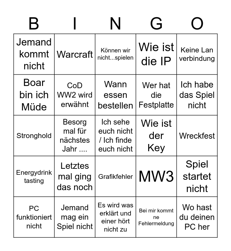 This bingo card has a free space and 24 words: Letztes mal ging das noch, Jemand mag ein Spiel nicht, Wann essen bestellen, PC funktioniert nicht, Keine Lan verbindung, Jemand kommt nicht, Boar bin ich Müde, Warcraft, Wie ist der Key, Grafikfehler, Wer hat die Festplatte, Stronghold, MW3, Spiel startet nicht, CoD WW2 wird erwähnt, Bei mir kommt ne Fehlermeldung, Wreckfest, Können wir nicht...spielen, Ich habe das Spiel nicht, Besorg mal für nächstes Jahr ...., Wo hast du deinen PC her, Energydrink tasting, Wie ist die IP and Es wird was erklärt und einer hört nicht zu.
