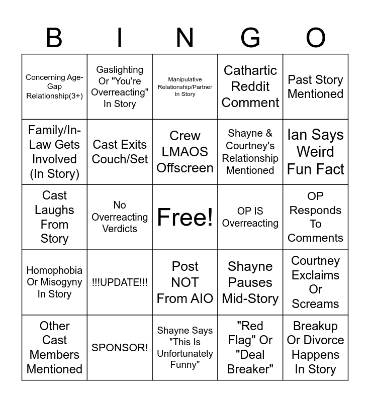This bingo card has a free space and 24 words: !!!UPDATE!!!, SPONSOR!, Crew LMAOS Offscreen, Other Cast Members Mentioned, Past Story Mentioned, Concerning Age-Gap Relationship(3+), Family/In-Law Gets Involved (In Story), Gaslighting Or "You're Overreacting" In Story, OP IS Overreacting, Post NOT From AIO, Shayne & Courtney's Relationship Mentioned, Cast Laughs From Story, Shayne Pauses Mid-Story, Courtney Exclaims Or Screams, Cast Exits Couch/Set, "Red Flag" Or "Deal Breaker", OP Responds To Comments, Manipulative Relationship/Partner In Story, Ian Says Weird Fun Fact, No Overreacting Verdicts, Breakup Or Divorce Happens In Story, Homophobia Or Misogyny In Story, Cathartic Reddit Comment and Shayne Says "This Is Unfortunately Funny".