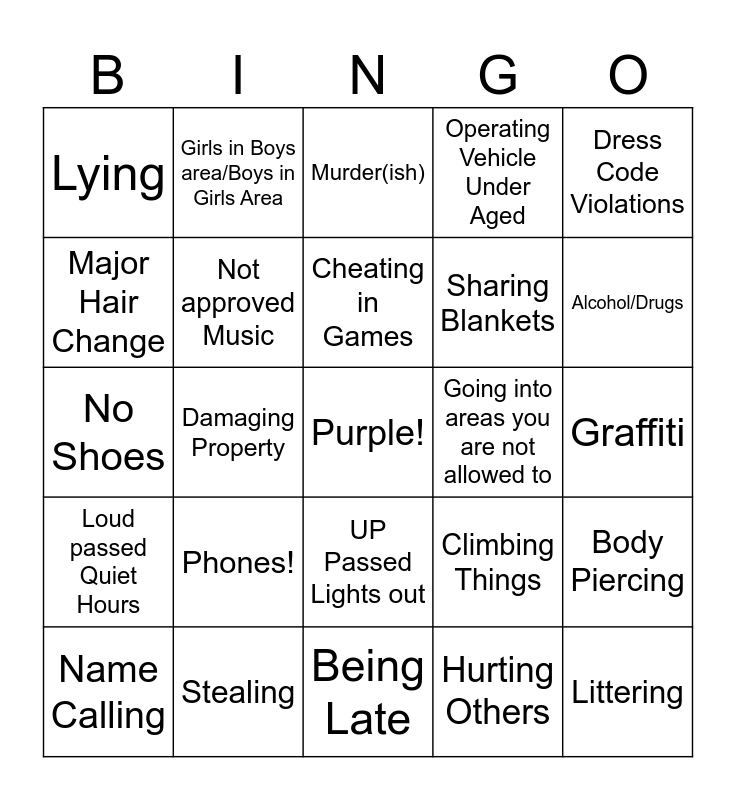 This bingo card has a free space and 29 words: Name Calling, Fighting, Damaging Property, Sneaking out, Lying, Murder(ish), Not approved Music, Phones!, Going into areas you are not allowed to, Stealing, Graffiti, Littering, Being Late, Hurting Others, Alcohol/Drugs, Not Participating in Songs, UP Passed Lights out, Loud passed Quiet Hours, Dress Code Violations, No Shoes, Climbing Things, Chewing Gum, Sharing Blankets, Major Hair Change, Operating Vehicle Under Aged, Girls in Boys area/Boys in Girls Area, Body Piercing, Cheating in Games and Fishing in Non-Fishing Area.