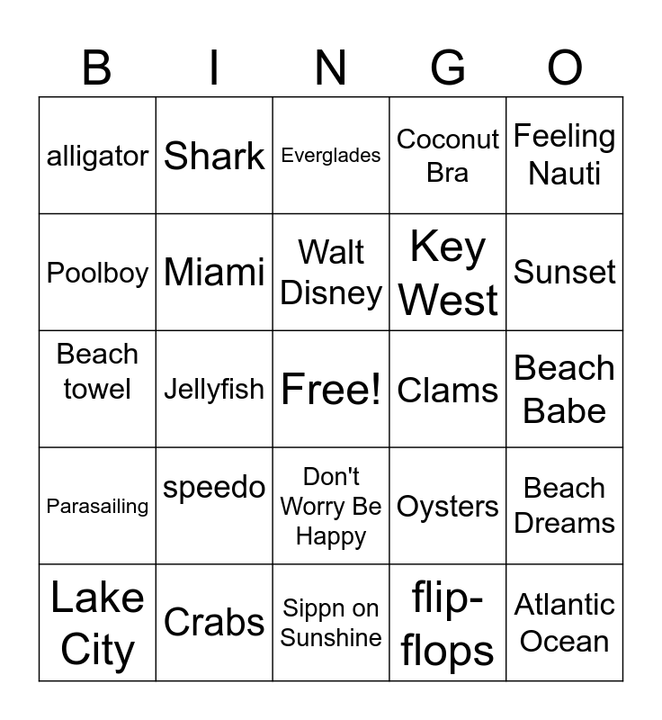 This bingo card has a free space and 24 words: speedo, Crabs, Walt Disney, Lake City, Feeling Nauti, alligator, Poolboy, Shark, Clams, Don't Worry Be Happy, Key West, Beach towel, Oysters, Beach Dreams, Miami, flip-flops, Beach Babe, Everglades, Sunset, Jellyfish, Atlantic Ocean, Parasailing, Coconut Bra and Sippn on Sunshine.